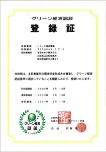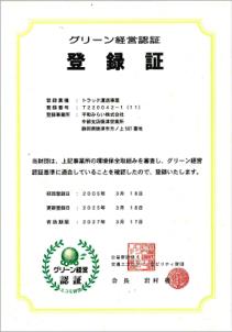 認証は更新制です。これからも平和みらいはグリーン経営の推進マニュアルに基づき、環境改善活動を推進していきます。