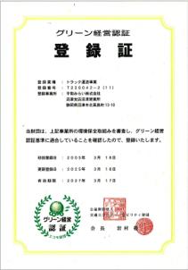焼津営業所、沼津営業所、浜松営業所が、倉庫・運送「グリーン経営」の認証を受けています。